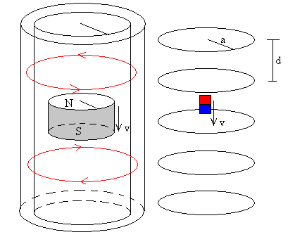Modelo electromecánicoVamos a elaborar un modelo que explique las características esenciales del movimiento del imán en un tubo metálico vertical. En este modelo sustituimos el tubo metálico que tiene un radio interior y un radio exterior, por un conjunto de espiras del mismo radio a, separadas una distancia d. El imán se mueve a lo largo del eje vertical común de las espiras. Supondremos que cada espira presenta una resistencia R al paso de la corriente inducida. En la figura, se muestran las corrientes inducidas que se generan en el tubo por delante y por detrás del imán. No consideraremos los efectos de la autoinducción de cada espira, ni la inducción mutua entre espiras. En las páginas tituladas “Demostración de la ley de Faraday”, hemos estudiado la corriente inducida producida en una espira, cuando un imán se mueve a lo largo de su eje con velocidad constante. La corriente inducida no afecta al movimiento del imán.
