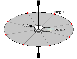 En el centro del disco se coloca una pequeña bobina cuyo eje coincide con el eje de rotación del disco. Por la bobina pasa una corriente estacionaria de intensidad i, alimentada por una batería. En el borde del disco, y espaciadas uniformemente alrededor de su circunferencia hay un número de pequeñas esferas metálicas aisladas unas de las otras y del solenoide por el material plástico del disco. Cada una de las esferas conductoras está cargada con la misma carga q. Inicialmente, el disco está en reposo. Supongamos que por algún accidente la corriente i en el solenoide se interrumpe. Por ejemplo, el solenoide se mantiene a muy baja temperatura de modo que el alambre del que está fabricado se hace superconductor. Cuando la temperatura se eleva por encima de la crítica, su resistencia aumenta y la corriente disminuye. Al disminuir el flujo del campo magnético a través del solenoide se producirá un campo eléctrico inducido tangencial al perímetro del disco que actuará sobre las esferas cargadas, produciendo una fuerza, cuyo momento hará girar al disco. Tenemos una situación similar a la descrita en la página dedicada al estudio del acelerador de partículas denominado betatrón. El campo eléctrico producido por el cambio del flujo del campo magnético en el tiempo acelera la partícula cargada Aplicando el principio de conservación del momento angular, podemos decir, que el momento angular inicial del sistema aislado es cero, el momento angular final del conjunto será cero. Por tanto, no debe haber rotación del disco cuando la corriente desaparezca, esta es la paradoja.