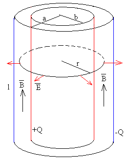 Momento angular del campo electromagnéticoHemos calculado, aplicando la ley de Gauss, el campo eléctrico producido por dos conductores cilíndricos coaxiales de longitud l y de radios b y a cargados con carga Q iguales y opuestas.