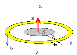 Fijarse que el cálculo directo del flujo a través del disco no es sencillo ya que no disponemos de una expresión de B para puntos en el interior de la bobina o cercanos a la misma. Teniendo en cuenta que el momento magnético tiene la dirección del eje Z m=m·k, el campo B para los puntos del plano que contiene al disco z=0 es