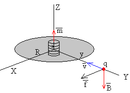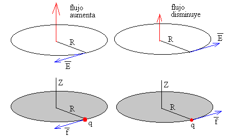 De acuerdo a la ley de Faraday Debido a la simetría axial, el campo eléctrico E generado es constante en todos los puntos de una circunferencia de radio r, y su dirección es tangente a dicha circunferencia. El campo eléctrico E generado vale en la posición r=R del borde del disco donde se encuentran las cargas Su sentido está determinado por la ley de Lenz, tal como se señala en la figura. El campo eléctrico E ejerce una fuerza sobre la carga puntual q, f=qE La fuerza f tiene la misma dirección que el campo E, el mismo sentido si la carga q es positiva, y sentido contrario si la carga es negativa. La fuerza f, produce un momento que hace girar al disco. Si la carga total Q está uniformemente distribuida en el perímetro del disco, el momento M de la fuerza que ejerce el campo eléctrico E sobre las cargas es El momento de una fuerza actuando durante un tiempo modifica el momento angular del sólido en rotación alrededor de un eje fijo. El momento angular final Lmec del disco tiene la dirección del eje de rotación, y su módulo es Siendo m el momento magnético inicial.
