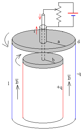 Las figuras indican la dirección y el sentido del momento M para la placa circular inferior. Para la placa circular superior el sentido de M es el contrario. Teniendo en cuenta que el volumen de la capa cilíndrica (en color amarillo) de espesor d comprendida entre r y r+dr es dV=2πrdr·d. El momento Mb de las fuerzas que ejerce el campo magnético sobre la corriente i en la placa inferior es Para la placa circular superior el momento Ma se calcula de forma similar dando El momento total es M=Ma-Mb=iB(a2-b2)/2. La dirección de M es la del eje de rotación y su sentido positivo (hacia arriba) El momento mecánico angular final es donde Q es la carga final de los conductores (véase carga de un condensador) Como a>b el momento angular mecánico tiene la dirección del eje de rotación y sentido positivo (hacia arriba).