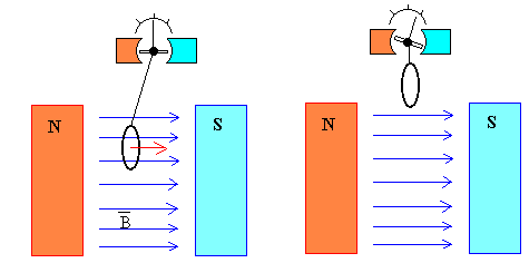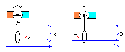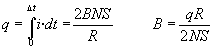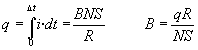 Medida de un campo magnético uniformeUn campo magnético uniforme se puede medir girando rápidamente media vuelta una bobina exploradora. La carga que pasa a través de la bobina se mide mediante un galvanómetro cuyo periodo de oscilación es mucho mayor que el tiempo que tarda la bobina en girar media vuelta. El flujo en la situación inicial de la bobina es F =NS·B, y en la situación final es F=-NS·B. El flujo cambia en DF =-2NS·B en un pequeño intervalo de tiempo Dt. Aplicando la ley de Faraday, la fem vale Si la resistencia total del circuito es R. La carga que pasa por el galvanómetro se obtiene integrando la intensidad de la corriente inducida i=Ve /R. Como el galvanómetro balístico nos mide la carga q, conociendo los datos relativos a la bobina exploradora (área S y número de espiras N) podemos despejar el valor de la intensidad del campo magnético B.