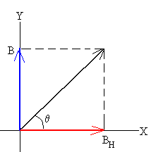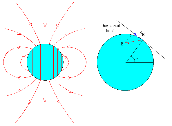 Medida de la componente horizontal del campo magnético terrestreEn la figura, se muestra un modelo simplificado del campo magnético terrestre, que en una primera aproximación, es el mismo que el de una esfera imantada uniformemente. Los polos geográfico y magnético de la Tierra no coinciden, e incluso a lo largo de la historia se han producido inversiones de los polos magnéticos. Como puede apreciarse en la parte derecha de la figura, la componente horizontal (local) del campo magnético terrestre BH se dirige siempre hacia el polo Norte. Para medir esta componente, se pueden realizar distintos experimentos. Primer método