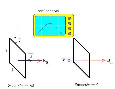 El valor que se ha medido de esta componente en España es del orden de 0.25·10-4 T =0.25 gauss. Segundo método El segundo método se basa en la ley de Faraday. Disponemos de una bobina rectangular formada por N espiras de área S Colocamos el eje de la bobina en la dirección Norte-Sur, y la giramos rápidamente 180º. La carga total producida por la fem inducida se puede medir mediante un galvanómetro balístico tal como se ha descrito en el aparatado anterior. Ahora bien, el osciloscopio es un instrumento presente en un laboratorio que se puede conectar a la bobina y así, se puede observar de forma directa el fenómeno de la inducción electromagnética. La traza que se observa en la pantalla del osciloscopio es la representación gráfica de la fem en función del tiempo. La ley de Faraday es Integramos respecto del tiempo entre los instantes t=0, y Δt. Siendo Δt el tiempo que tarda la espira en girar 180º, tal como se indica en la figura. El primer miembro es el área bajo la curva Vε, en función del tiempo, el segundo es la diferencia entre el flujo inicial y el final Φi- Φf=NBHS·cos0º-(NBHScos180º)=2NBHS Siendo N el número de espiras, y S=a·b el área de cada una de ellas. Despejamos la componente horizontal del campo magnético BH