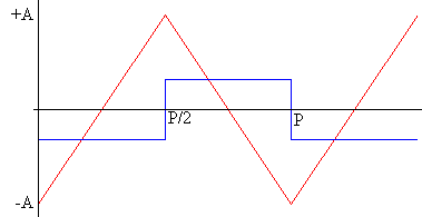 Señal de forma triangularCuando el potencial del generador crece linealmente (en color rojo), el flujo a través de cada espira del secundario crece linealmente, la fem inducida en el secundario (en color azul) tiene un valor constante negativo (parte izquierda de la figura) Si el flujo F =at, (0<t< P/2) , a es la pendiente Cuando el potencial del generador decrece linealmente (en color rojo), la fem en el secundario (en color azul) muestra un valor constante positivo (parte central de la figura) Si F =a·(P-t), (P/2<t< P) Señal de forma senoidalEste caso ya lo hemos estudiado en la página precedente, espiras en un campo magnético variable con el tiempo