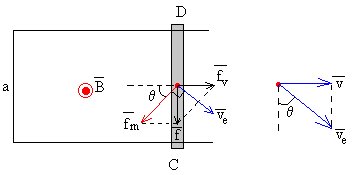 En el apartado “Fuerza sobre los portadores de carga” se ha mencionado que la fuerza sobre los portadores de carga es f=qvB, que dicha fuerza tiene la dirección de la varilla, y realiza un trabajo vBa sobre la unidad de carga que se mueve desde D a C, esto en realidad no sucede. Como vamos a ver la fuerza f=q·v×B sobre la unidad de carga es la suma de dos fuerzas, la fuerza que ejerce la varilla sobre la carga y la fuerza magnética Los portadores de carga se mueven horizontalmente con velocidad v y también a lo largo de la varilla, de D a C. La velocidad de los portadores de carga positivos ve hacen un ángulo θ, con la varilla, de modo que la componente horizontal de la velocidad de los portadores de carga debe ser igual a la velocidad constante v de la varilla, ve·senθ=v. Las fuerzas sobre los portadores de carga son: