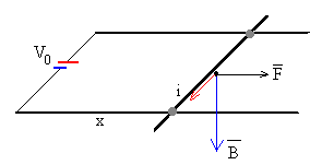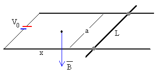 En presencia de un campo magnético uniforme B, perpendicular al plano del circuito, la barra se acelera por la fuerza de Lorentz hasta que alcanza una velocidad límite constante. Supondremos que los raíles son superconductores, para que el problema no sea complicado de resolver. De otro modo, se introduciría un término no lineal (al aumentar la longitud del circuito) en las ecuaciones del movimiento de la varilla.