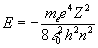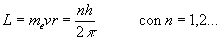 En el modelo de Bohr, solamente están permitidas aquellas órbitas cuyo momento angular está cuantizado. n es un número entero que se denomina número cuántico, y h es la constante de Planck 6.6256·10-34 Js Los radios de las órbitas permitidas son donde a0 se denomina radio de Bohr. a0 es el radio de la órbita del electrón del átomo de Hidrógeno Z=1 en su estado fundamental n=1. La energía total es En una órbita circular, la energía total E es la mitad de la energía potencial La energía del electrón aumenta con el número cuántico n. La primera energía de excitación es la que lleva a un átomo de su estado fundamental a su primer (o más bajo) estado excitado. La energía del estado fundamental se obtiene con n=1, E1= -13.6 eV y la del primer estado excitado con n=2, E2=-3.4 eV. Las energías se suelen expresar en electrón-voltios (1eV=1.6 10-19 J) La frecuencia f de la radiación emitida cuando el electrón pasa del estado excitado E2 al fundamental E1 es