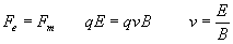 Se pulsa el botón titulado Empieza y se observa una desviación nula del haz de electrones. Se obtiene el valor de la velocidad del haz, dividiendo la intensidad del campo eléctrico E entre la intensidad del campo magnético B. El valor del campo eléctrico se ha de multiplicar por 10000, y el valor del campo magnético está expresado en gauss (0.0001 T). La velocidad del haz de electrones es Encontrar otros valores del campo del campo eléctrico y del campo magnético que den lugar a una desviación nula del haz de electrones. Medida de la relación carga/masa Una vez obtenido el valor de la velocidad del haz de electrones, se activa el botón de radio Carga/masa y desaparece el campo magnético, Se introduce