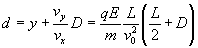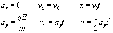 Los electrones no se desvían, si ambas fuerzas son iguales y de sentido contrario. Por tanto, atravesarán el selector de velocidades sin desviarse, aquellos electrones cuya velocidad v sea igual cociente E/B. Medida de la relación carga/masa La trayectoria seguida por el haz de electrones entre las placas del condensador, la hemos estudiado ya en la página dedicada al estudio del osciloscopio. Volveremos a repetir las ecuaciones del movimiento. Movimiento entre las placas del condensador Cuando eliminamos el campo magnético, el electrón se mueve bajo la acción de la fuerza eléctrica F=qE constante en la región del condensador perpendicular a la dirección inicial de su velocidad. Utilizamos las ecuaciones del movimiento curvilíneo bajo aceleración constante Si L es la longitud del condensador, la desviación vertical y de la partícula al salir de sus placas será Movimiento fuera de las placas del condensador Una vez que el electrón ha salido de las placas del condensador, sigue un movimiento rectilíneo uniforme, hasta que llega a la pantalla. La desviación total del haz en la pantalla situada a una distancia D del condensador es Donde vy y vx son las componentes del vector velocidad en el instante en el que el electrón abandona la región situada entre las placas del condensador x=L.