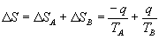 Procesos irreversibles. Principio de incremento de entropíaConsideremos, de nuevo, un sistema formado por dos subsistemas A y B, el número de microestados del sistema combinado es P=PA·PB , tomando logaritmos neperianos y a partir de la definición de entropía llegamos a S=SA+SB La entropía es una magnitud aditiva, ya que la entropía del sistema combinado es la suma de las entropías de los subsistemas A y B que lo forman. Calculemos ahora la variación de entropía cuando una cantidad de calor q se transfiere de forma espontánea desde el subsistema A a temperatura TA hacia el subsistema B a temperatura TB. El subsistema A disminuye su entropía, pero aumenta la de B. Como TA>TB, el cambio de entropía D S>0 del sistema combinado es positivo, su entropía aumenta. Si inicialmente los subsistemas A y B están en equilibrio, al ponerlos en contacto el sistema combinado deja de estar en equilibrio. El número de microestados P=PA·PB tiende hacia un valor máximo. Por esta razón la energía fluye espontáneamente desde un cuerpo caliente hacia uno frío cuando se ponen en contacto y nunca ocurre el proceso inverso.