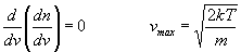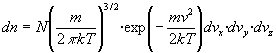Distribución de las velocidades de las moléculasPara un gas ideal monoatómico la energía de las moléculas es solamente cinética E=mv2/2. En la fórmula (1) efectuamos el cambio de variable E por v. Resultando la expresión que es la fórmula de Maxwell para la distribución de velocidades de las moléculas de un gas ideal. Nos proporciona el número dn de moléculas que se mueven con una velocidad comprendida entre v y v+dv independientemente de la dirección del movimiento. Deducción alternativa Existe otra manera de deducir la distribución de velocidades de Maxwell El número de moléculas cuya velocidad está comprendida entre v y v+dv, es decir entre vx y vx+dvx, vy y vy+dvy, vz y vz+dvz, de acuerdo a la ley de Boltzmann es