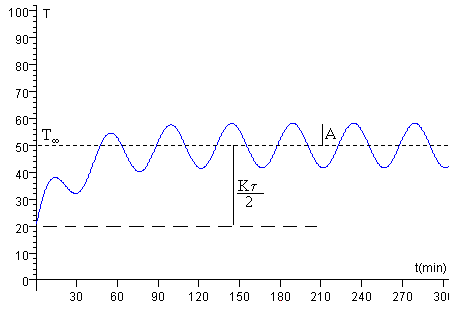 La temperatura T crece desde Ta debido al calentamiento del líquido del recipiente, sigue un comportamiento complejo durante un cierto tiempo, hasta que alcanza el estado estacionario (teóricamente cuando t→∞). Si la constante de tiempo τ es pequeña el estado estacionario se alcanza rápidamente. El último término (la exponencial decreciente) acaba tendiendo a cero y el estado estacionario se describe por una temperatura que oscila con frecuencia 2ω, y amplitud A, alrededor del valor medio T∞, tal como se aprecia en la figura.