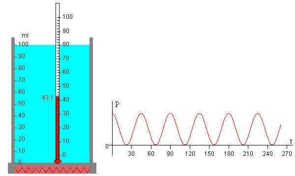 En la página titulada “Evaporación del agua”, se calienta un recipiente de agua con un hornillo eléctrico de potencia P constante. Se observa el incremento de la temperatura del agua. Si la potencia del hornillo eléctrico es suficiente o las pérdidas no son grandes, el agua alcanza la temperatura de ebullición. En el caso de que la potencia del hornillo eléctrico no fuese suficiente o las pérdidas fuesen grandes, el agua no alcanzaría la temperatura máxima de ebullición. En esta página, vamos a analizar los cambios de temperatura del líquido contenido en un recipiente cuando por la resistencia del hornillo eléctrico circula una corriente alterna que hace que el líquido se caliente de forma periódica. Supondremos que el recipiente pierde calor y lo transfiere a la atmósfera y que estas pérdidas obedecen a la ley de enfriamiento de Newton. El régimen de temperaturas del líquido se puede dividir en dos partes: