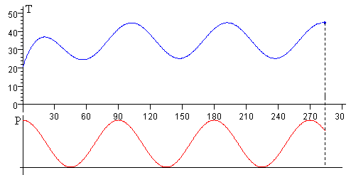 La temperatura T (en color azul) está desfasada f respecto de la potencia P (en color rojo), tal como se aprecia en la figura (más abajo)