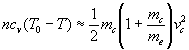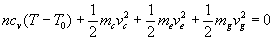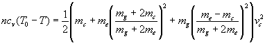 la temperatura final se calcula a partir de p y V o bien, a partir de la ecuación de la adiabática expresada en términos de T y V. Balance energéticoAl expandirse adibáticamente el gas ideal su temperatura disminuye y por tanto, su energía interna también disminuye. Esta energía se convierte en energía cinética del cilindro, del émbolo y del centro de masas del gas. La variación de energía interna DU de un gas ideal se calcula mediante la fórmula DU=ncv(T-T0) n es el número de moles del gas y cv es el calor específico a volumen constante, y T-T0 la variación de temperatura. Como T<T0 la energía interna disminuye. La expresión el balance energético del sistema aislado de tres componentes nos queda de la siguiente forma Si la masa del gas mg es mucho más pequeña que la masa del émbolo me y del cilindro mc esta expresión se simplifica La velocidad del cilindro vc es independiente del gas que lo contiene. A partir de esta ecuación, calculamos la velocidad del cilindro vc, la del émbolo ve y la del c. m. del gas vg.