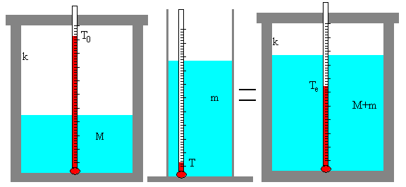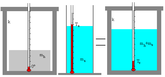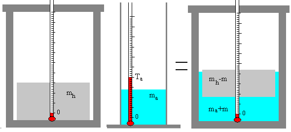 T-Ta≈T-Te. En la experiencia que se describe a continuación, se emplea el procedimiento de las mezclas pero no se tiene en cuenta las pérdidas o ganancias de calor entre el calorímetro y el medio ambiente. Una masa ma de agua a la temperatura inicial Ta se mezcla con una masa mh de hielo a 0º C en un calorímetro. La mezcla de agua y hielo se agita hasta que se alcanza una temperatura final de equilibrio Te. Pueden ocurrir dos casos