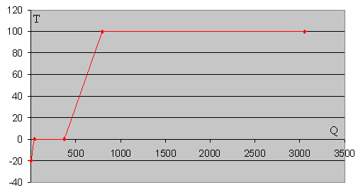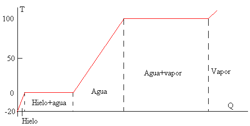 Q4=0.001·2260·103=2260 J El calor total Q=Q1+Q2+Q3+Q4=3053.8 J. Si disponemos de una fuente de calor que suministra una energía a razón constante de q J/s podemos calcular la duración de cada una de las etapas En la figura, que no se ha hecho a escala, se muestra cómo se va incrementando la temperatura a medida que se aporta calor al sistema. La vaporización del agua requiere de gran cantidad de calor como podemos observar en la gráfica y en los cálculos realizados en el ejemplo. La figura de abajo, está hecha a escala con el programa Excel de Microsoft, tomando los datos de la tabla