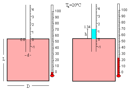 Con los datos de L=5.514 cm, D=5.5 cm, d=0.59 cm, ρ0=999.84 kg/m3, y la medida de la altura h de líquido en el tubo de vidrio h=0.79 cm Despejamos la densidad del agua ρa a la temperatura ambiente Ta=20ºC ρa=998.20 kg/m3 Densidad ρ del agua a la temperatura T Comparando la parte izquierda y derecha de la figura, tendremos la relación ρ0·S·L= ρ·S·L+ ρa·s·h (Recuérdese, que el agua contenida en el tubo de vidrio está a la temperatura ambiente Ta=20ºC) Si la medida de la altura del agua en el tubo de vidrio es h=1.34 cm cuando T=25ºC, la densidad del agua ρ a esta temperatura será ρ=997.05 kg/m3.