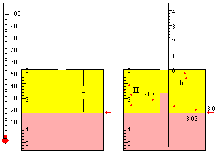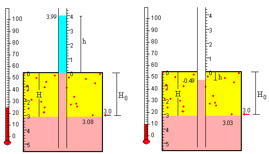 Sumergimos el recipiente en un baño a 0ºC que contenga una mezcla de agua y hielo. Llenamos el recipiente de agua hasta una altura determinada H0 (véase la figura de la izquierda), lo cerramos con un tapón atravesado por el tubo de vidrio que va a hacer el papel de manómetro que nos permitirá medir la presión de vapor de un modo análogo a como medimos la densidad del agua a distintas temperaturas. Antes de cerrar el recipiente tenemos un volumen S·H0 (en color amarillo) que contiene na moles de aire a la presión atmosférica Pa y a la temperatura de 0ºC. Suponiendo que el aire se comporta como un gas ideal Patm·S·H0=na·R·273