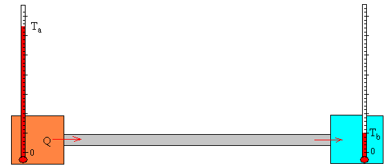 Variaciones de entropía en procesos irreversiblesPara calcular las variaciones de entropía de un proceso real (irreversible) hemos de recordar que la entropía (como la energía interna) depende solamente del estado del sistema. Una variación de entropía cuando el sistema pasa de un estado A a otro B de equilibrio depende solamente del estado inicial A y del estado final B. Para calcular la variación de entropía ΔS de un proceso irreversible entre dos estados de equilibrio, imaginamos un proceso reversible entre el estado inicial A y el estado final B y calculamos para este proceso Como veremos en los ejemplo, la variación de entropía ΔS es siempre positiva para el sistema y sus alrededores en un proceso irreversible. La entropía de un sistema aislado que experimenta un cambio siempre se incrementa. En un proceso reversible la entropía del sistema aislado permanece constante. Conducción térmica En el proceso de conducción del calor, el sistema está formado por un foco caliente a la temperatura Ta conectado mediante una barra a un foco frío a la temperatura Tb. La barra hecha de un material conductor del calor está perfectamente aislada. Se transfiere a través de la barra una cantidad de calor Q del foco caliente al foco frío. Como el foco frío absorbe calor, su entropía aumenta en Q/Tb. Al mismo tiempo, como el foco caliente pierde calor su variación de entropía es -Q/Ta Como Ta>Tb, la variación de entropía del sistema formado por la barra y los dos focos es positivo