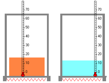 Calorímetro de mezclasEn un calorímetro de mezclas, una sustancia de masa m1 y calor específico c1 y temperatura inicial T1 se coloca en contacto con una segunda sustancia de masa m2, calor específico c2 y temperatura inicial T2>T1. Las dos sustancias se colocan en un calorímetro de modo que forman ambas un sistema aislado. Una vez que alcanzan el equilibrio térmico a la temperatura Te vamos a calcular la variación de entropía. La sustancia que inicialmente tiene la temperatura mas alta cede calor a la sustancia que inicialmente tiene temperatura más baja, la primera disminuye su temperatura, la segunda la aumenta hasta que ambas alcanzan el equilibrio a la temperatura Te. m1·c1·(Te-T1)+m2·c2·(Te-T2)=0 El proceso es irreversible por que el sistema evoluciona desde el estado inicial al final a través de una serie de estado de no equilibrio. Para calcular la variación de entropía, podemos imaginar que la sustancia que tiene la temperatura más alta T1 se enfría hasta una temperatura Te poniéndola en contacto sucesivamente con focos de calor que difieren infinitesimalmente en temperatura, el primer foco tiene una temperatura T2 y el último Te. Podemos imaginar un proceso similar para la sustancia inicialmente a menor temperatura T2. El calor absorbido o cedido en un cambio infinitesimal de temperatura es dQ=mcdT Como Te>T1 el primer término es positivo, y como Te<T2 el segundo término es negativo, el resultado final es que ΔS>0