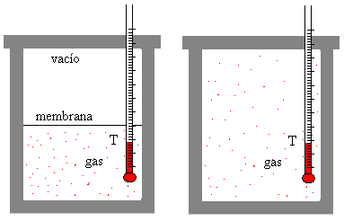 Expansión de un gasConsideremos la expansión adiabática de un gas ideal que ocupa inicialmente un volumen V1. Se rompe la membrana que separa el gas de la región en la que se ha hecho el vacío, el gas se expande irreversiblemente hasta ocupar un volumen V2. El trabajo realizado por el gas es cero W=0, y ya que las paredes del recipiente son aislantes, no se transfiere energía hacia el exterior, Q=0 Como la energía interna no cambia ΔU=0, la temperatura no cambia, ya que la energía interna de un gas ideal solamente depende de la temperatura T. Para calcular la variación de entropía, podemos imaginar un proceso reversible isotérmico a la temperatura T en la que el gas empuje muy despacio el émbolo mientras la energía entra en el gas procedente de un foco de calor para mantener la temperatura constante. En un proceso isotérmico, no hay variación de energía interna, el primer principio implica que el calor absorbido es igual al trabajo realizado por el gas durante su expansión de V1 a V2. dQ=dW=pdV