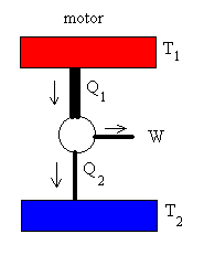 Equivalencia entre el enunciados de Clausius y de Kelvin-PlanckLas dos figuras que vienen a continuación nos muestran de forma gráfica la equivalencia de los enunciados de Clausius y de Kelvin-Planck. El conjunto de una máquina que transfiera calor del foco frío al caliente (Clausius) combinado con un motor nos dan como resultado una máquina que absorbe calor de una sola fuente y lo transforma íntegramente en trabajo (Kelvin-Planck). El conjunto de una máquina frigorífica con un móvil perpetuo (Kelvin-Planck) da lugar a una máquina que absorbe calor de una fuente fría y lo cede a una fuente caliente sin que se aporte trabajo (Clausius) Límite en el rendimiento de un motor realTodas las máquinas que funcionan reversiblemente entre los mismos focos tienen el mismo rendimiento térmico, cuya fórmula hemos obtenido en el estudio del ciclo de Carnot y que como hemos visto, depende únicamente del cociente entre las temperaturas del foco frío T2 y del foco caliente T1. En la figura, se demuestra que no puede existir un motor cuyo rendimiento sea mayor que el de Carnot operando entre las misma temperaturas. Dicho motor hipotético absorbe un calor Q'1 del foco caliente, realiza un trabajo W' y cede un calor Q2 al foco frío. Parte de dicho trabajo W se emplea en accionar un frigorífico que absorbe un calor Q2 del foco frío y cede un calor Q1 al foco caliente. Como podemos apreciar en la figura la combinación del motor hipotético de mayor rendimiento que el de Carnot con un frigorífico da lugar a la imposibilidad enunciada por Kelvin-Planck