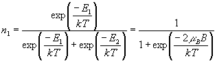 Los átomos pueden estar en uno u otro de los dos niveles de energía E1 y E2. Aplicando la fórmula de la distribución de Boltzmann podemos calcular la proporción de átomos que ocupan cada uno de los dos niveles de energía Naturalmente, n2=1-n1 n1 es mayor que n2, ya que la exponencial decreciente en el denominador no puede ser mayor que la unidad, ni menor que cero. Por tanto, hay más átomos con el momento paralelo al campo magnético que con el momento magnético apuntando en sentido contrario al campo. La sustancia presenta un momento magnético no nulo. <m>=n1 mB+n2(-mB) Como El momento magnético medio es inversamente proporcional a la temperatura absoluta de la sustancia, el comportamiento de los materiales paramagnéticos.