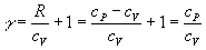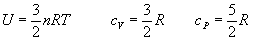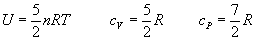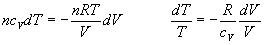 Calores específicos a presión constante cP y a volumen constante cVEn una transformación a volumen constante dU=dQ=ncVdT En una transformación a presión constante dU=ncPdT-pdV Como la variación de energía interna dU no depende del tipo de transformación, sino solamente del estado inicial y del estado final, la segunda ecuación se puede escribir como ncVdT=ncPdT-pdV Empleando la ecuación de estado de un gas ideal pV=nRT, obtenemos la relación entre los calores específicos a presión constante y a volumen constante cV=cP-R Para un gas