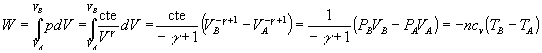 Donde el exponente de V se denomina índice adiabático g del gas ideal Si A y B son los estados inicial y final de una transformación adiabática se cumple que Para calcular el trabajo es necesario efectuar una integración similar a la transformación isoterma. Como podemos comprobar, el trabajo es igual a la variación de energía interna cambiada de signo Si Q=0, entonces W=-DU=-ncV(TB-TA) |
