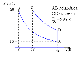 Se activa el botón de radio titulado Monoatómico Proceso A→ B En el estado inicial, introducimos p=1.5 atm Se especifica el proceso, activando el botón de radio titulado Adiabático Estado final, introducimos p=30 atm Obtenemos el valor de las variables desconocidas V y T del estado final V=7.95 litros El trabajo W=-249.96 atm·l Se pulsa el botón titulado <<<<, el estado final B es el inicial del siguiente proceso Proceso B→ C Estado inicial p=30 atm Se especifica el proceso, activando el botón de radio titulado Isóbara, p=30 atm Estado final, introducimos (el doble del volumen de B) V=15.90 litros Obtenemos el valor de la variable desconocida T del estado final T=1941.12 K El trabajo: W=238.36 atm·l Se pulsa el botón titulado <<<<, el estado final C es el inicial del siguiente proceso Proceso C→ D Estado inicial p=30 atm Se especifica el proceso, activando el botón de radio titulado Isóterma, T=1941.12 K Estado final, introducimos V=48 litros Obtenemos el valor de la variable desconocida p del estado final p=9.94 atm El trabajo: W=527.03 atm·l Se pulsa el botón titulado <<<<, el estado final D es el inicial del siguiente proceso Proceso D→ A Estado inicial p=9.94 atm Se especifica el proceso, activando el botón de radio titulado Isócora, V=48 l Estado final, introducimos p=1.5 atm Obtenemos el valor de la variable desconocida T del estado final T=293 K El trabajo: W=0 atm·l Ciclo completo Variación de energía interna: ΔU=249.96+357.54+0-607.5=0 Comprobamos que W=Qabs-Qced Rendimiento del ciclo