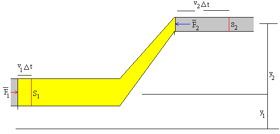 Ecuación de la continuidadConsideremos una porción de fluido en color amarillo en la figura, el instante inicial t y en el instante t+Dt. En un intervalo de tiempo Dt la sección S1 que limita a la porción de fluido en la tubería inferior se mueve hacia la derecha Dx1=v1Dt. La masa de fluido desplazada hacia la derecha es Dm1=r·S1Dx1=rS1v1Dt. Análogamente, la sección S2 que limita a la porción de fluido considerada en la tubería superior se mueve hacia la derecha Dx2=v2Dt. en el intervalo de tiempo Dt. La masa de fluido desplazada es Dm2=r S2v2 Dt. Debido a que el flujo es estacionario la masa que atraviesa la sección S1 en el tiempo Dt, tiene que ser igual a la masa que atraviesa la sección S2 en el mismo intervalo de tiempo. Luego