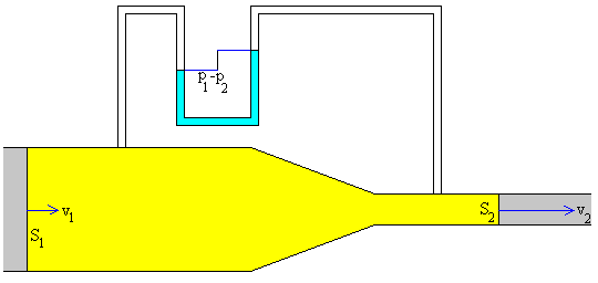 Efecto VenturiCuando el desnivel es cero, la tubería es horizontal. Tenemos entonces, el denominado tubo de Venturi, cuya aplicación práctica es la medida de la velocidad del fluido en una tubería. El manómetro mide la diferencia de presión entre las dos ramas de la tubería. La ecuación de continuidad se escribe v1S1=v2S2 Que nos dice que la velocidad del fluido en el tramo de la tubería que tiene menor sección es mayor que la velocidad del fluido en el tramo que tiene mayor sección. Si S1>S2, se concluye que v1<v2. La en la ecuación de Bernoulli con y1=y2 Como la velocidad en el tramo de menor sección es mayor, la presión en dicho tramo es menor. Si v1<v2 se concluye que p1>p2 El líquido manométrico desciende por el lado izquierdo y asciende por el derecho Podemos obtener las velocidades v1 y v2 en cada tramo de la tubería a partir de la lectura de la diferencia de presión p1-p2 en el manómetro. Ejemplo: Determinar la velocidad del agua en ambos tramos de la tubería, sabiendo que: