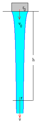 Esta relación se denomina ecuación de continuidad. En la figura, el radio del primer tramo de la tubería es el doble que la del segundo tramo, luego la velocidad del fluido en el segundo tramo es cuatro veces mayor que en el primero. Ejemplo: Cuando se abre poco a poco un grifo, se forma un pequeño chorro de agua, un hilo cuyo radio va disminuyendo con la distancia al grifo y que al final, se rompe formando gotas. La ecuación de continuidad nos proporciona la forma de la superficie del chorrito de agua que cae del grifo, tal como apreciamos en la figura.