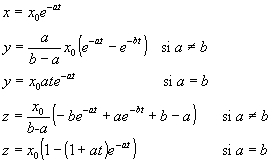 Evidentemente, por muy grande que fuese la cantidad inicial de Radio en el momento de la formación de la Tierra, al desintegrase, con un periodo de desintegración tan pequeño comparado con la edad de la Tierra, la cantidad existente actualmente sería despreciable. Su presencia se debe a que forma parte de un producto intermedio de una serie radioactiva. Uranio (238)® Torio(234) ® Protactinio(234) ® Uranio(234) ® Torio(230) ® Radio(226) ® ..... Plomo(206) La existencia de Uranio en cantidades importantes y su elevada vida media 4.56 109 años hace que podamos encontrar Radio como resultado de su desintegración. La baja vida media de los productos intermedios explica la invariabilidad en la proporción de dichos elementos ya que estamos en una situación estacionaria. En nuestra serie A® B® C, en el estado estacionario, dy/dt=0, por lo que ax=by. Podemos calcular la cantidad de sustancia radioactiva y conociendo x y sus respectivas vidas medias. Si a es pequeño (vida media grande) x disminuye lentamente, la situación de equilibrio dura bastante tiempo. En todos los casos, la sustancia estable C crece continuamente. Caso particularCuando la constante del tubo-capilar A es igual a la constante del tubo-capilar B, a=b. Observamos en la representación gráfica de las respectivas alturas x (en azul) e y (en rojo) de las columnas de fluido, x=x0·exp(-a·t) La intersección de ambas curvas se produce en el máximo de la segunda curva