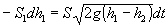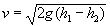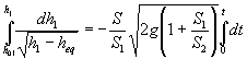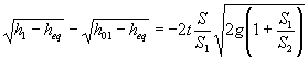 Fundamentos físicosDos recipientes de secciones S1 y S2 están comunicados por un tubo de sección S inicialmente cerrado. Si las alturas iniciales de fluido en los recipientes h01 y h02 son distintas, al abrir el tubo de comunicación, el fluido pasa de un recipiente al otro hasta que las alturas h1 y h2 del fluido en los dos recipientes se igualan. Si h01>h02, la altura h1 del fluido en el primer recipiente disminuye y aumenta la altura h2 en el segundo recipiente. La cantidad total de fluido no cambia, de modo que S1h1+S2h2=S1h01+S2h02=(S1+S2)heq Donde heq es la altura final de equilibrio. Vamos ahora a deducir la función que describe la evolución de la altura h1 o h2 con el tiempo t. El teorema de Torricelli afirma que la velocidad de salida del fluido por un orificio situado en el fondo de un recipiente es Siendo h la altura del fluido en el recipiente por encima del orificio Si ahora tenemos dos depósitos conectados, podemos describir el comportamiento de los vasos comunicantes suponiendo que la velocidad del fluido en el tubo de comunicación es proporcional a la raíz cuadrada de la diferencia de alturas que alcanza el fluido en ambos recipientes. La cantidad de fluido que sale del primer recipiente a través del tubo que comunica ambos recipientes en la unidad de tiempo es vS, y en el tiempo dt será vSdt. La disminución de la altura h1 en el primer recipiente se expresa del siguiente modo Escribiendo h2 en función de h1, podemos integrar fácilmente esta ecuación Se alcanza la altura de equilibrio heq después de un tiempo t que se calcula poniendo en la ecuación precedente h1=heq. Ejemplo: Sean las alturas iniciales h01=25 cm y h02=10 cm, Los datos de los recipientes y del tubo de comunicación son
