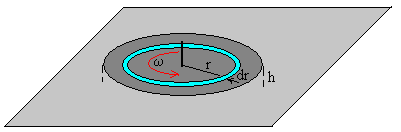 Fundamentos físicosEl coeficiente de viscosidad está relacionado con la distribución de velocidades en las capas de fluido situadas entre dos superficies en movimiento relativo. Las velocidades de estas capas tienen que ser menores que la velocidad media de las moléculas del gas, que es mayor que 500 m/s a temperatura ambiente, 293ºK . Al estudiar el concepto de viscosidad, vimos que la fuerza por unidad de área era proporcional al gradiente de velocidad, la constante de proporcionalidad se denomina coeficiente de viscosidad h En un instante t, el disco gira con velocidad angular ω. Consideremos el gas contenido en la capa cilíndrica de radio r, espesor dr y altura h. El gas que está cerca de la placa horizontal tiene velocidad cero y el gas que está próximo al disco, lleva una velocidad angular ωr.