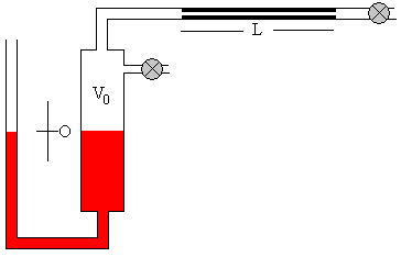 La ley de Poiseuille se escribe El signo menos aparece por que la presión p del gas disminuye a medida que sale por el tubo capilar Integramos esta ecuación teniendo en cuenta que dm/dt es constante a lo largo del tubo capilar. La presión en el extremo x=0 del tubo capilar es p y la presión en el otro extremo x=L es p0 (atmosférica). El dispositivo experimentalEn la figura, se muestra la situación inicial del dispositivo. El manómetro de mercurio a la izquierda, el volumen V0 de la región comprendida entre el mercurio y el tubo capilar, el tubo capilar de longitud L y radio r. El gas cuya viscosidad se va a medir, se introduce en la región comprendida entre el mercurio del manómetro y el capilar, hasta alcanzar la presión p deseada.