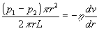 Sustituyendo F en la fórmula (1) y teniendo en cuenta que el área A de la capa es ahora el área lateral de un cilindro de longitud L y radio r. El signo negativo se debe a que v disminuye al aumentar r.