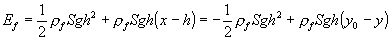 Cuando el cuerpo está parcialmente sumergido, sobre el cuerpo actúan dos fuerzas el peso mg=rsSh·g que es constante y el empuje rfSx·g que no es constante. Su resultante es F=(-rsShg+rfSxg)j. Donde S el área de la base del bloque, h la altura del bloque y x la parte del bloque que está sumergida en el fluido. Tenemos una situación análoga a la de un cuerpo que se coloca sobre un muelle elástico en posición vertical. La energía potencial gravitatoria mgy del cuerpo disminuye, la energía potencial elástica del muelle kx2/2 aumenta, la suma de ambas alcanza un mínimo en la posición de equilibrio, cuando se cumple mg+kx=0, cuando el peso se iguala a la fuerza que ejerce el muelle. El mínimo de Ep se obtiene cuando la derivada de Ep respecto de y es cero, es decir en la posición de equilibrio. La energía potencial del cuerpo parcialmente sumergido será, de forma análoga El mínimo de Ep se obtiene cuando la derivada de Ep respecto de y es cero, es decir, en la posición de equilibrio, cuando el peso se iguale al empuje. -rsShg+rfSxg=0 El bloque permanece sumergido una longitud x. En esta fórmula, se ha designado r como la densidad relativa del sólido (respecto del fluido) es decir, la densidad del sólido tomando la densidad del fluido como la unidad. Fuerzas sobre el bloque