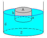 Supongamos un cuerpo en forma de paralepípedo de altura h, sección A y de densidad ρs. El fluido está contenido en un recipiente de sección S hasta una altura b. La densidad del fluido es ρf> ρs. Se libera el cuerpo, oscila hacia arriba y hacia abajo, hasta que alcanza el equilibrio flotando sobre el líquido sumergido una longitud x. El líquido del recipiente asciende hasta una altura d. Como la cantidad de líquido no ha variado S·b=S·d-A·x Hay que calcular x, de modo que la energía potencial del sistema formado por el cuerpo y el fluido sea mínima. Tomamos el fondo del recipiente como nivel de referencia de la energía potencial. El centro de masa del cuerpo se encuentra a una altura d-x+h/2. Su energía potencial es Es=(ρs·A·h)g(d-x+h/2) Para calcular el centro de masas del fluido, consideramos el fluido como una figura sólida de sección S y altura d a la que le falta una porción de sección A y altura x.