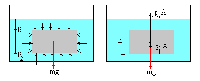 Ejemplo:Supongamos un cuerpo sumergido de densidad ρ rodeado por un fluido de densidad ρf. El área de la base del cuerpo es A y su altura h. La presión debida al fluido sobre la base superior es p1= ρfgx, y la presión debida al fluido en la base inferior es p2= ρfg(x+h). La presión sobre la superficie lateral es variable y depende de la altura, está comprendida entre p1 y p2. Las fuerzas debidas a la presión del fluido sobre la superficie lateral se anulan. Las otras fuerzas sobre el cuerpo son las siguientes: