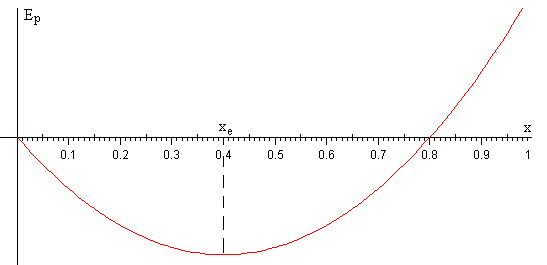 La energía potencial del fluido es Ef=ρf(Sb)g·yf La energía potencial total es Ep=Es+Ef El valor de la constante aditiva cte, depende de la elección del nivel de referencia de la energía potencial. En la figura, se representa la energía potencial Ep(x) para un cuerpo de altura h=1.0, densidad ρs=0.4, parcialmente sumergido en un líquido de densidad ρf=1.0. La función presenta un mínimo, que se calcula derivando la energía potencial con respecto de x e igualando a cero En la posición de equilibrio, el cuerpo se encuentra sumergido