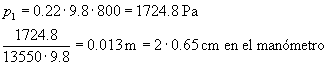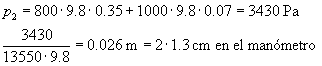 Se proporcionan los datos de las densidades de los dos líquidos inmiscibles y del líquido manométrico. Densidad del agua 1000 kg/m3, densidad del aceite 800 kg/m3, densidad del mercurio 13550 kg/m3 Comparar los cálculos efectuados por ambos métodos, y con el que proporciona el programa interactivo pulsando en el botón titulado Respuesta.