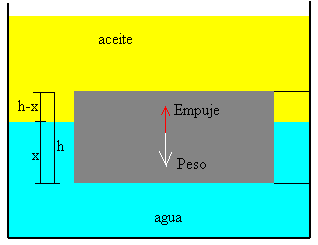 Un cuerpo sólido está sumergido en dos líquidos inmiscibles: agua y aceite. Determinaremos la densidad de dicho cuerpo por dos métodos distintos: El aceite que tiene una densidad 0.8 g/cm3 se sitúa en la parte superior y el agua que es más densa 1.0 g/cm3 se sitúa en la parte inferior del recipiente. La densidad del bloque es un número al azar comprendido entre la densidad del aceite 0.8, y la del agua 1.0. Un cuerpo de esta densidad flota entre los dos líquidos. Principio de ArquímedesConociendo que parte del sólido está sumergido en aceite (fluido 1) o en agua (fluido 2), se determinará la densidad de dicho cuerpo. El principio de Arquímedes nos dice que si el bloque está en equilibrio, el peso del bloque debe ser igual al empuje proporcionado por ambos líquidos. Peso del bloque =empuje del agua + empuje del aceite ρShg=ρ2Sxg+ρ1S(h-x)g S es el área de la base del bloque, h su altura, y x es la parte del bloque sumergida en agua. En general, un cuerpo que flota en la superficie del agua, está sumergido en dos fluidos, uno es el agua ρ2=1000 kg/m3 y el otro es el aire ρ1=1.29 kg/m3. Habitualmente, se desprecia la densidad del aire frente a la del sólido ρ y la del fluido ρ2, aplicándose la fórmula aproximada Ejemplo Supongamos que hemos seleccionado un bloque de h=20 cm de altura. Al pulsar el botón Nuevo, observamos que el bloque está sumergido 13 cm en aceite y 7 cm en agua. ρ·20=0.8·13+1.0·7 Despejando en la fórmula la densidad del sólido, obtenemos el valor de 0.87 g/cm3. Este valor lo podemos comparar con el proporcionado por el programa al pulsar el botón titulado Respuesta.