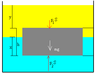Ecuación fundamental de la estática de fluidosMediante el manómetro vamos a medir las presiones p1 y p2 sobre la cara superior e inferior del bloque sumergido. La cara superior está en el aceite a una profundidad y. La presión p1 será igual a la atmosférica p0 más la correspondiente a la altura y de aceite. p1=p0+ρ1gy La cara inferior está en el agua. La presión p2 será igual a la presión atmosférica p0 más la correspondiente a la altura de aceite (y+h-x) más la correspondiente a la altura de la columna de agua (x) p2=p0+ρ1g(y+h-x)+ρ2gx La fuerza que ejerce el fluido sobre dichas caras será el producto de la presión por el área de su superficie S. Como podemos ver en la figura, para que haya equilibrio se tiene que cumplir que p1S+mg=p2S Introduciendo los valores de p1 y p2 en esta ecuación y teniendo en cuenta que m=r·hS despejamos el valor de x. Es el mismo resultado que hemos obtenido aplicando el principio de Arquímedes Ejemplo: Datos: densidad del agua 1000 kg/m3, densidad del aceite 800 kg/m3, densidad del mercurio 13550 kg/m3 La cara superior está a 22 cm de la superficie libre, la presión debida al aceite es La cara inferior está a 42 cm de la superficie libre (35 cm de aceite y 7 cm de agua), la presión debida a ambos líquidos es: En el equilibrio se cumple Se obtiene rs=870 kg/m3 ó 0.87 g/cm3