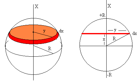El empuje es el peso en agua del volumen de la parte sumergida. Calculamos el volumen de la parte de la esfera sumergida en agua. Este volumen V es la suma (integral) de los elementos diferenciales de volumen de radio y y de altura dx, uno de los cuales se muestra en la figura.
