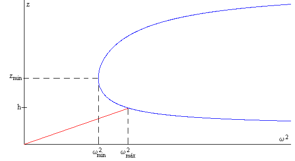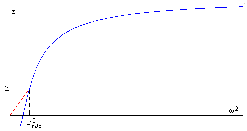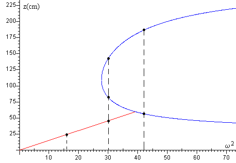 Estados de equilibrioEn la figura, se representa la altura adicional z en el brazo vertical más alejado del eje en función del cuadrado de la velocidad angular ω2 de rotación, para los valores de